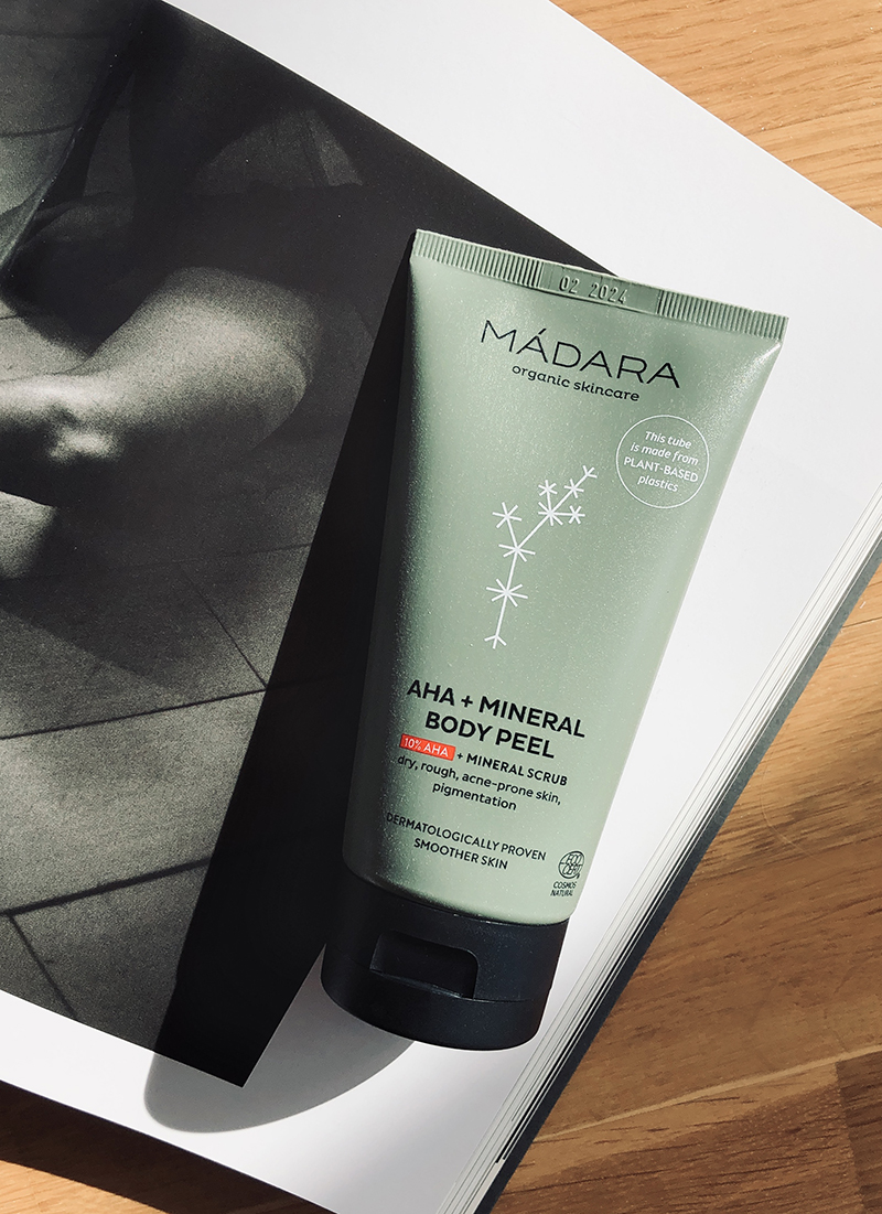 AHA-happopitoisia vartalotuotteita on harmillisen vähän, ja tunnen vain kaksi: *Mádara AHA + Mineral Body Peel ja *Frank Body AHA Body Lotion. Mádaran tuote on poishuuhdottava kuorintavoide, Frank Bodyn voide taas on iholle jätettävä kosteusvoide. Mádaran kuorintatuotteessa 10% AHA-happoja (maitohappoa) ja sen ohella myös perliitti-rakeita, kyseessä on siis 2 in 1 kemiallinen & fysikaalinen kuorintavoide.