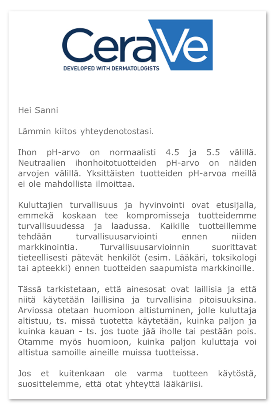 Edit 10.12. CeraVe'lta vastattiin (täysin asian vierestä):