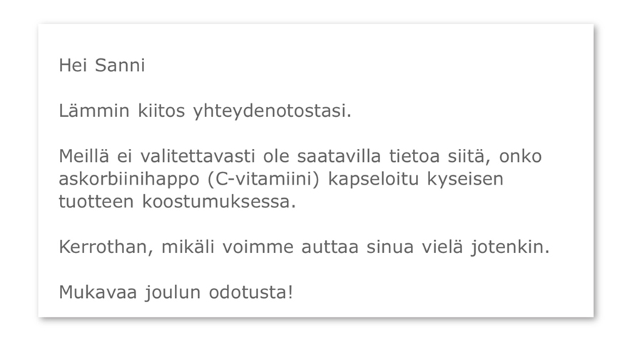Tuota. 😳 He ovat tuotteen valmistaja, ja heillä "ei ole saatavilla tietoa siitä, onko askorbiinihappo kapseloitu kyseisen tuotteen kootumuksessa". Ooo-kei.