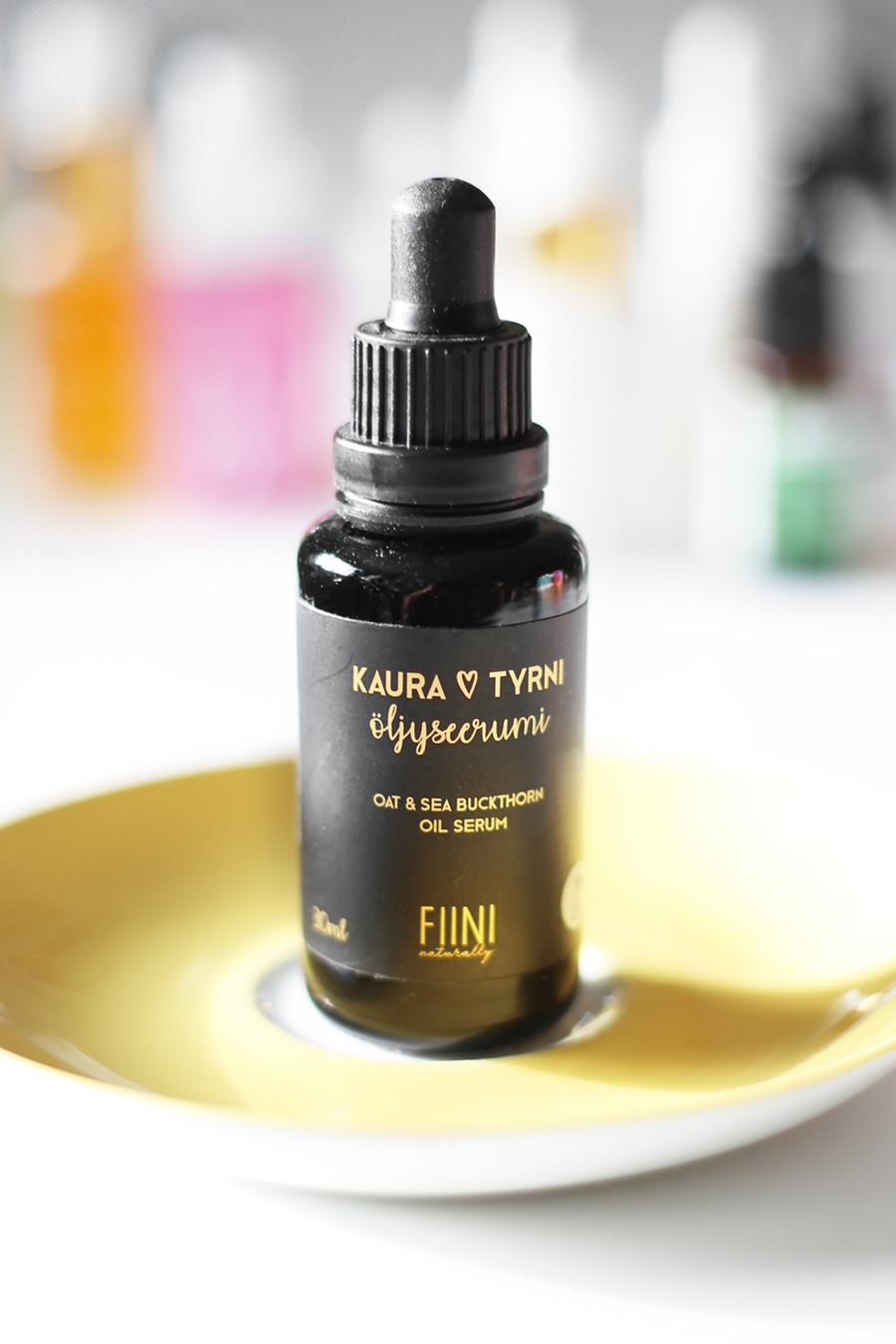 Fiinin ihastuttava Kaura & Tyrni -kasvoöljy sisältää vain neljä ainesosaa: kauraöljyä, jojobaöljyä, tyrniöljyä ja E-vitamiinia. Se on erinomainen kasvoöljy kuivalle, oikein herkälle ja ikääntyneelle iholle, myös ärtyneelle iholle. Kaura & jojoba luovat tuotteen rauhoittavan ja ravitsevan pohjan, ja tyrni tuo siihen antioksidanttisen ja ihoa uudistavan lisävaikutuksen. Kuten makadamia, myös tyrni sisältää harvinaista Omega-7-rasvahappoa, joka on todella hyvä aine kuivalle sekä ikääntyneelle iholle.