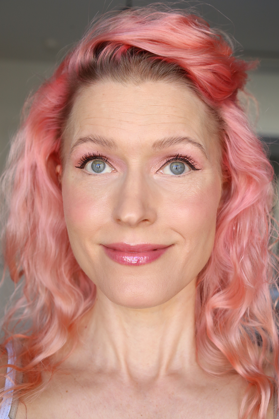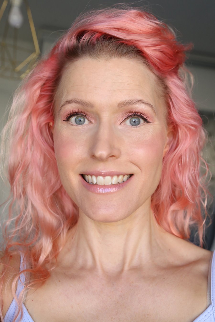 Kuvan meikkilookissa kasvoillani on uusi Stay Smooth -peiteaine, huulilla uusi Dream Lip Gloss sävyssä Berry Boost, silmämeikissä Dermosilin vaaleanpinkkiä Muumi-poskipunaa ja poskilla Dermosilin huulipuna sävyssä Retro. Käytän todella usein huulipunaa poskilla, toimii upeasti!
