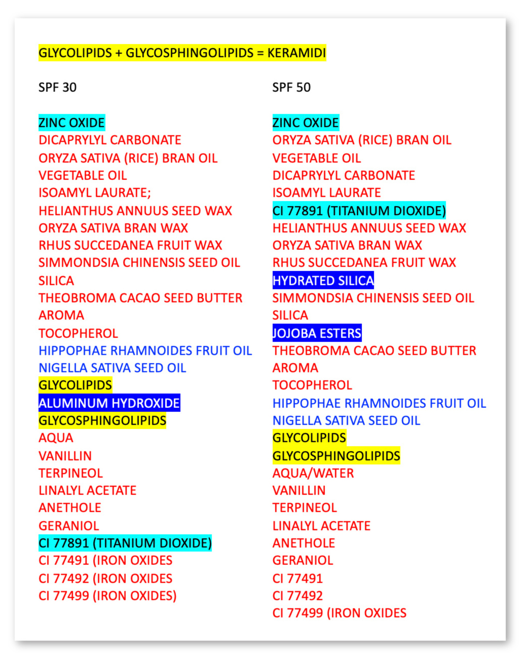 Muuten ainesosat ovat samat ihan muutamaa teknistä ainesosaa lukuun ottamatta. Uutuuden nimeen on nostettu keramidit, mutta myös alkuperäisessä SPF 50 -puikossa on samat keramidit. Tuotteet ovat käytännössä puuterimaisten ainesosien määrää lukuun ottamatta identtiset.