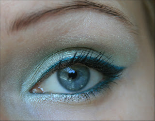 Siipirajaus on aina yksinkertainen tapa saada tehoa meikkiin. Tähän meikkiin tein kaksoisrajauksen vihreällä ja mustalla ja pidin pohjan hempeän yksivärisenä. Koko luomelle on levitetty pistaasinvihreää IsaDoran Blooming Spring -paletista ja sitä on sävytetty Pure Luxen Cabanalla joka on hyvin vaalea turkoosi. Cabana toi luomen sävyyn kimalletta ja eloisuutta, mikä tosin ei näistä kuvista niin välity mutta livenä yhdistelmä oli todella kaunis. Levitin Cabanaa myös alaluomen sisänurkkaan tuomaan valoa. Kulmaluulla Revlonin Frosty White. Rajaukseen käytin Urban Decayn 24/7 Glide On -kynää sävyssä Covet sekä Indelible-geelirajausta sävyssä Magnetism.