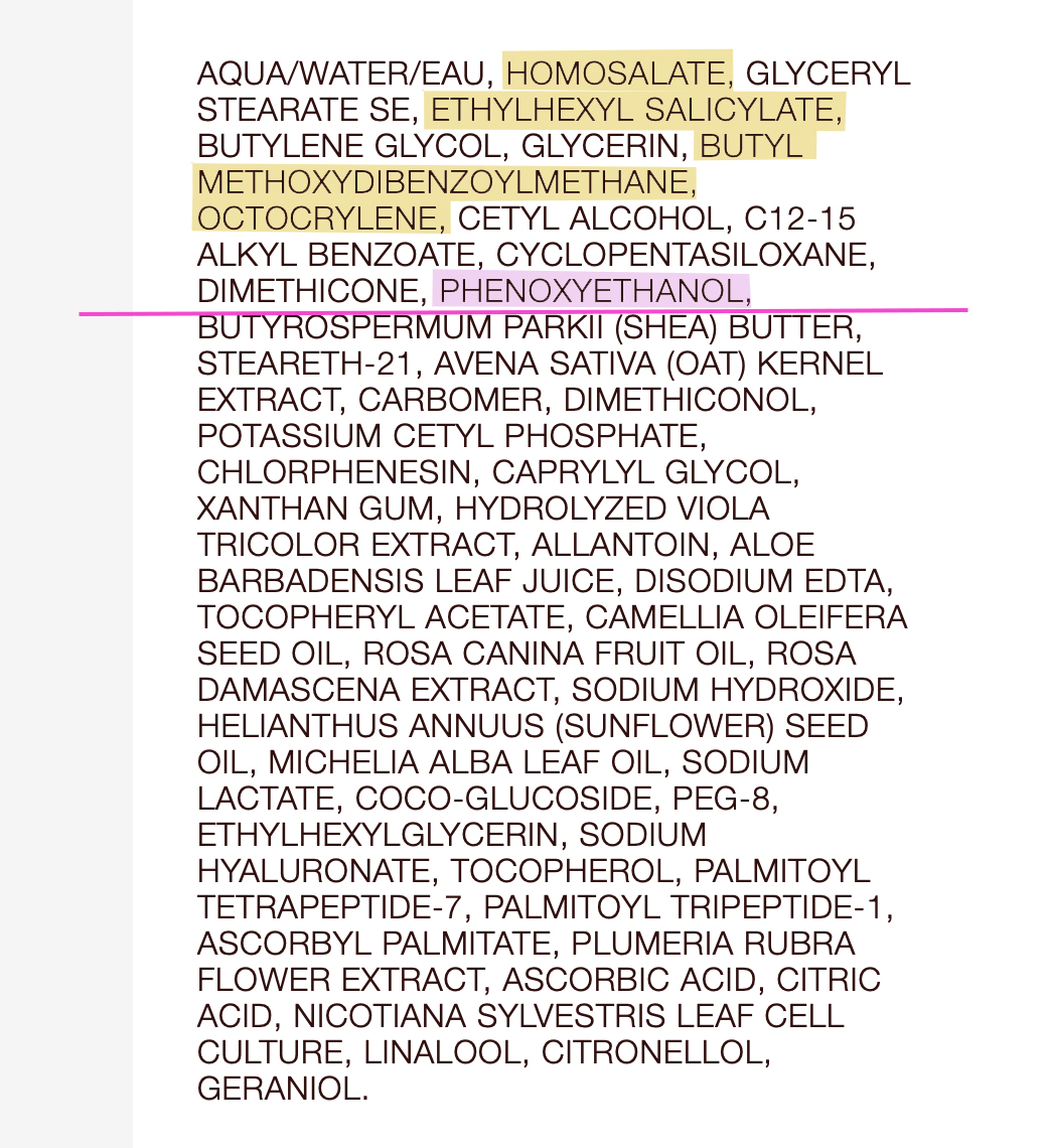 Kuvassa Magic Creamin inci. Merkkasin keltaisella UV-filtterit ja pinkillä säilöntäaine fenoksietanolin. Fenoksietanoli on hyödyllinen ainesosa, kun halutaan arvioida jonkin kosmetiikkatuotteen ainesosien pitoisuuksia. Fenoksietanolin sallittu maksimikäyttömäärä on 1%, joten kaikkia sen jälkeen incissä olevia ainesosia on 1% tai vähemmän.