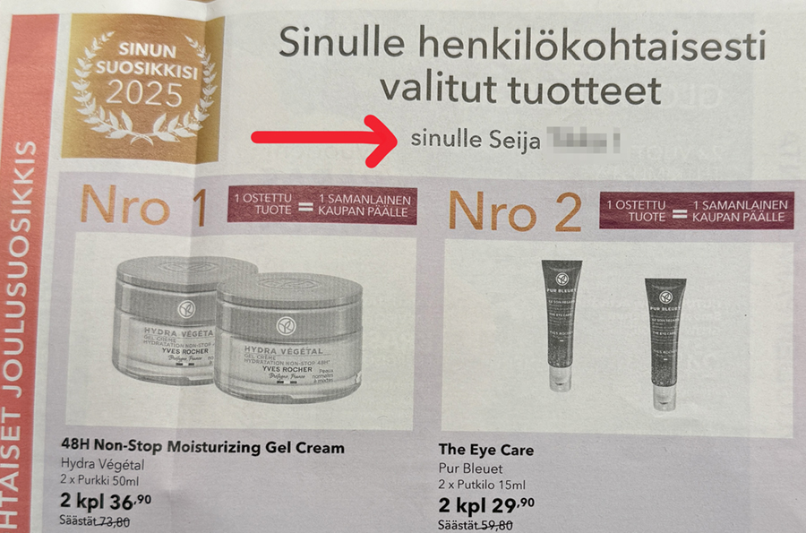 Olen laittanut Yves Rocherille viestin jossa pyydän avaamaan tapahtunutta. Onko heillä enää ylipäänsä lainkaan "yleisiä" mainoksia, vaan ovatko mainokset aina personoituja ja kohdennettu vain vakituisesti tilaaville asiakkaille.