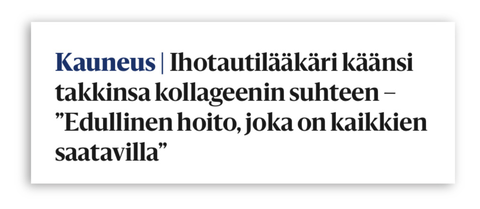 Tammikuussa Hesarissakin oli raflaava otsikko, jossa ihotautilääkärin kerrottiin "kääntäneen takkinsa" ja puhuvan nyt kollageeni-ravintolisän ihohyötyjen puolesta. Kyseinen lääkäri on Ihosairaalan ihotautilääkäri Carl Kyrklund. Jos olet Hesarin tilaaja, jutun voi lukea täältä.