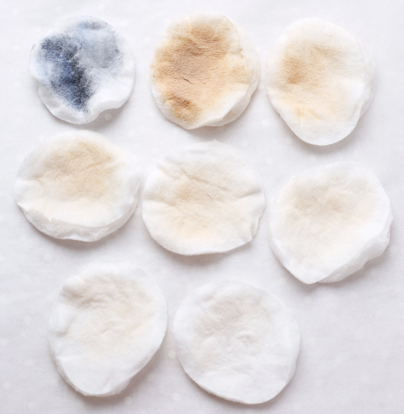 Kuten sanottua, en itse koskaan käyttäisi misellivettä ainoana putsarina, mutta tätä arviota varten kokeilin poistaa sillä kaiken lian ja meikin. Tähän kului 4 vanulappua -kummaltakin puolelta - ja kymmenittäin pyyhkäisyjä. Kasvoillani oli perussilmämeikki (ei mitään vedenkestävää) ja kevyt mineraalimeikkipuuteripohja sekä peiteainetta silmien alla.