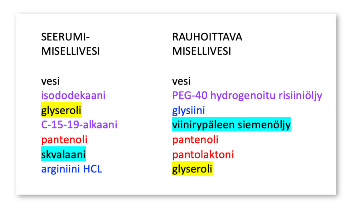 Kummassakin misellivedessä on seitsemän ylimmän ainesosan joukossa saman funktion ainesosat. Merkkasin violetilla puhdistavat ja liuottavat aineet, punaisella pantenolin, keltaisella glyserolin, sinisellä aminohappoyhdisteen ja turkoosilla öljyn.