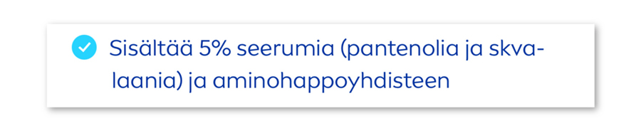 Mutta palataksemme Nivean seerumimiselliveteen, se mainostaa sisältävänsä 5% seerumia sekä aminohappoyhdisteen. 'Seerumi' on Nivean mukaan yhtä kuin 5% pantenolia ja skvalaania.