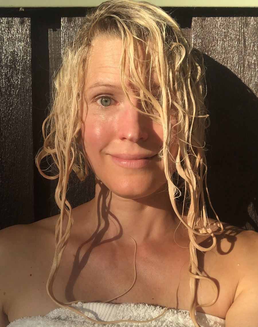 Käytin Regenerating-hoitotuotteita tunnollisesti kuuden viikon ajan, ja annoin naamion vaikuttaa joka kerta suositellun maksimiajan eli 20 minuuttia. (Yllä olevassa kuvassa istun mökin terassilla ilta-auringossa LAO-naamio hiuksissani. 😊)