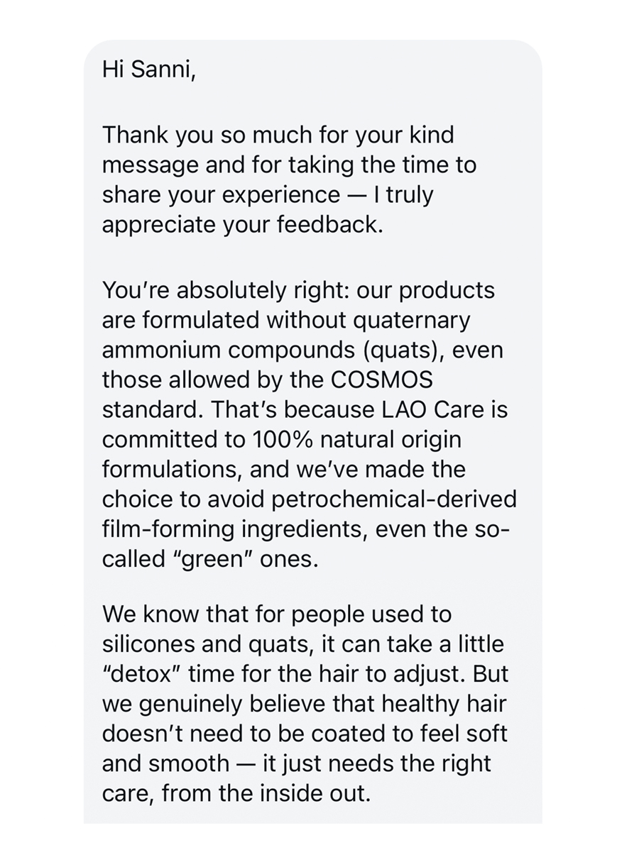 LAO vastasi, että heille on tärkeää valmistaa tuotteensa niin pitkälle luonnollisista raaka-aineista kuin mahdollista, ja tämä oli syy kvattien poisjäämiseen. He kirjoittivat, että kvatteihin tottuneella hiuksella voi mennä hetken aikaa mukautua kvatittomaan hoitoon, ja he uskovat, että silottavan kalvon sijaan hius hyötyy enemmän oikeasta hoidosta, joka lähtee hiuksen sisästä. (Vapaasti suomennettuna.)