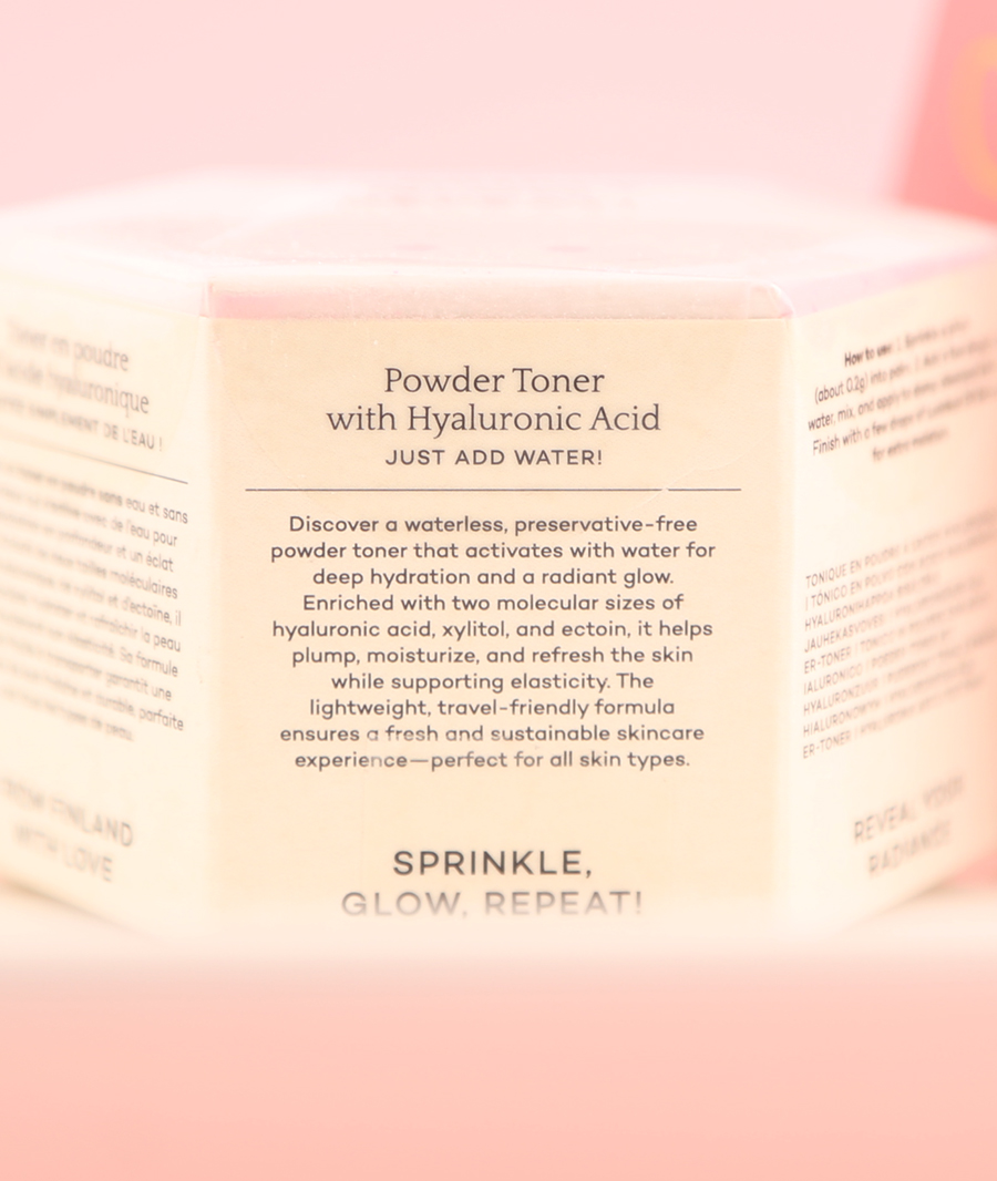Nimeä Glow Luminous Powder Toner kantava tuote tarjoaa ympäristöystävällisemmän vaihtoehdon perinteiselle vettä sisältävälle kasvovedelle.