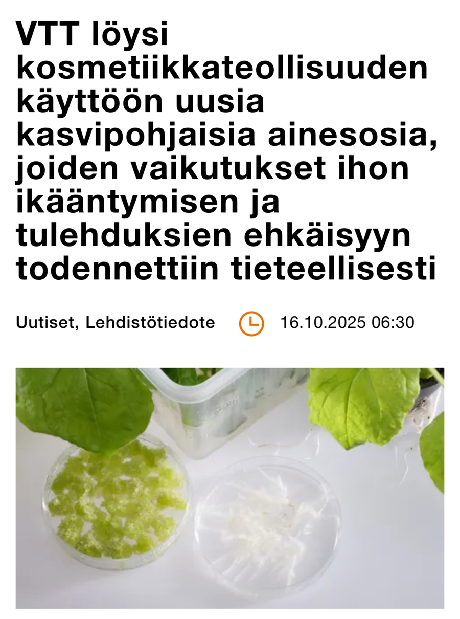 Teknologian Tutkimuskeskuksen VTT:n tutkijat ovat löytäneet uusia kasvipohjaisia ainesosia, joilla on tulehdusta ehkäiseviä ja ihon ikääntymismuutoksia hidastavia ominaisuuksia. Löydökset ovat osa EU:n rahoittamaa InnCoCells-hanketta, jonka tarkoituksena on löytää kosmetiikkateollisuuden käyttöön uusia, tieteellisesti tehonsa osoittaneita kasviyhdisteitä.