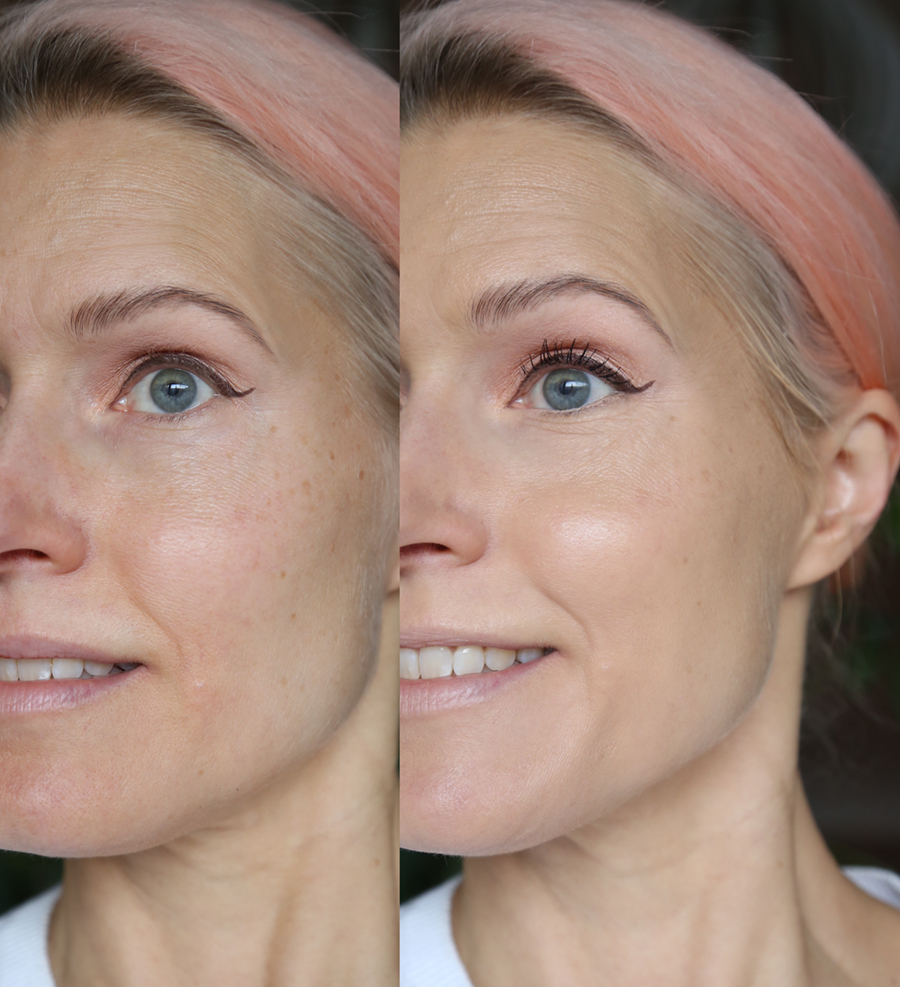 Tässä ennen/jälkeen -kuvassa kasvoillani on sävy 685 Desolate Shore, joka on keskivaalea ja neutraali sävy.