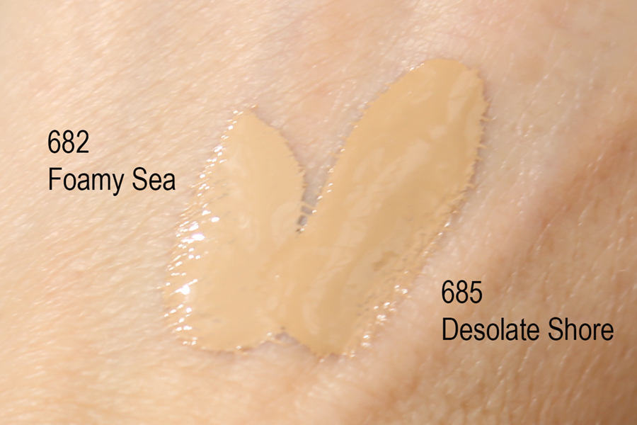 Sain aiemmin testiin sävyn 682 Foamy Sea, joka on vaalea lämmin sävy. Kuvauksensa ja swatchinkin perusteella se vaikutti enemmän minun sävyltäni, mutta onkin kasvoillani hieman liian vaalea. Desolate Shore taas sopii erinomaisesti.