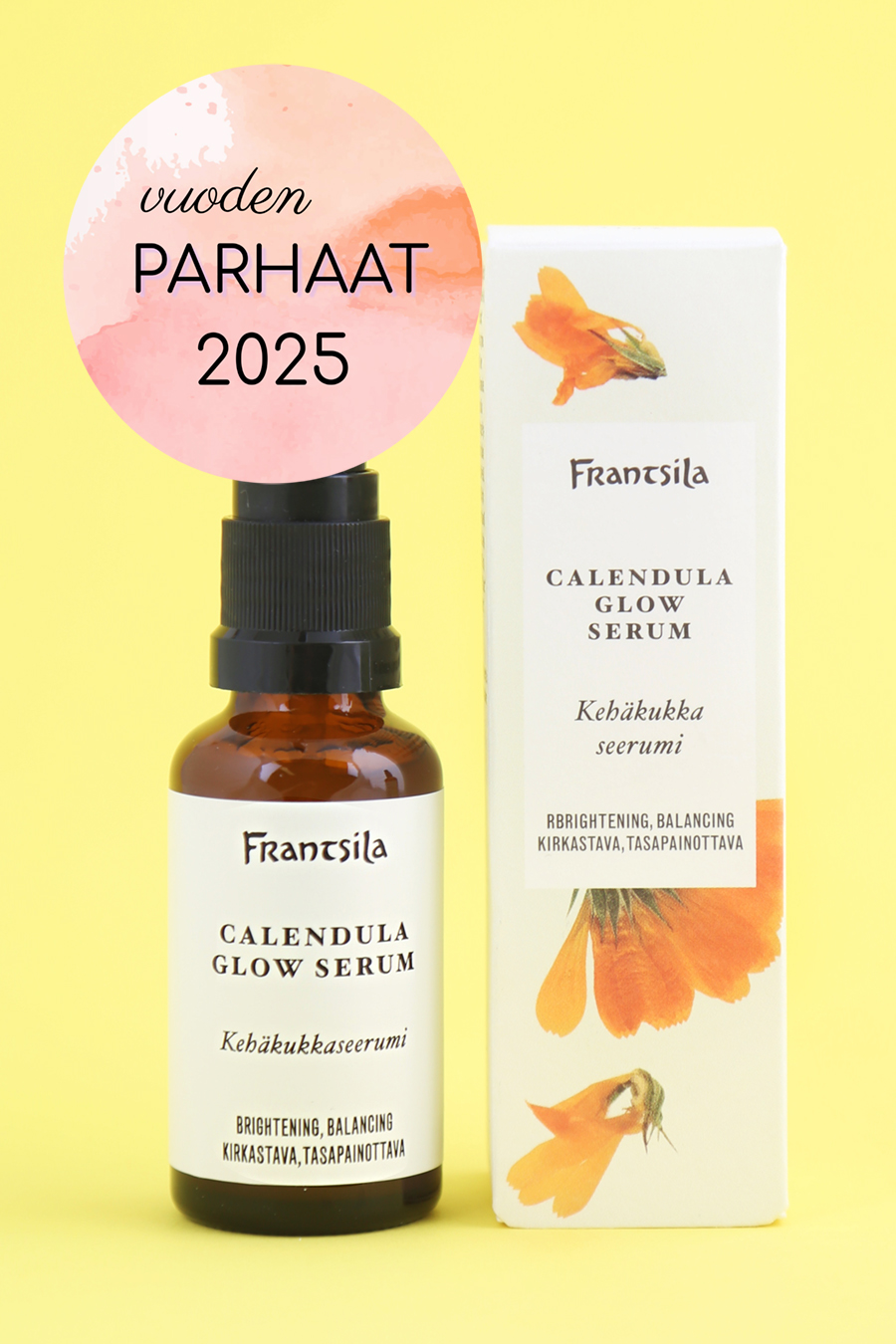 Tässä puolestaan ON herkällekin iholle sopiva C-vitamiiniseerumi! Frantsilan ihana uutuus yhdistää rauhoittavan kehäkukan sekä ihoa kirkastavan ja antioksdanttisesti suojaavan C-vitamiinijohdannaisen. Tässä seerumissa ei siis ole puhdasta C-vitamiinia kuten Joikissa, vaan lempeä sokerin ja C-vitamiinin muodostama yhdiste.