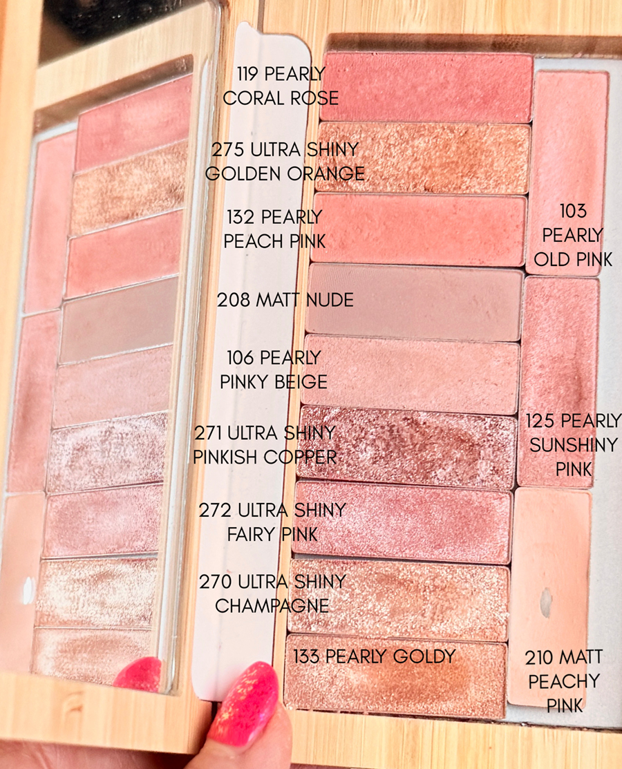 Suurimpia suosikkejani ovat *Ultra Shiny Fairy Pink, *Pearly Goldy, *Pearly Sunshiny Pink, *Ultra Shiny Pinkish Copper ja *Matt Peachy Pink - josta jo pannun pohja paistaa. Matt Peachy Pink on mun lämpimälle iholle aivan täydellinen nudevaalea 🙏🏻