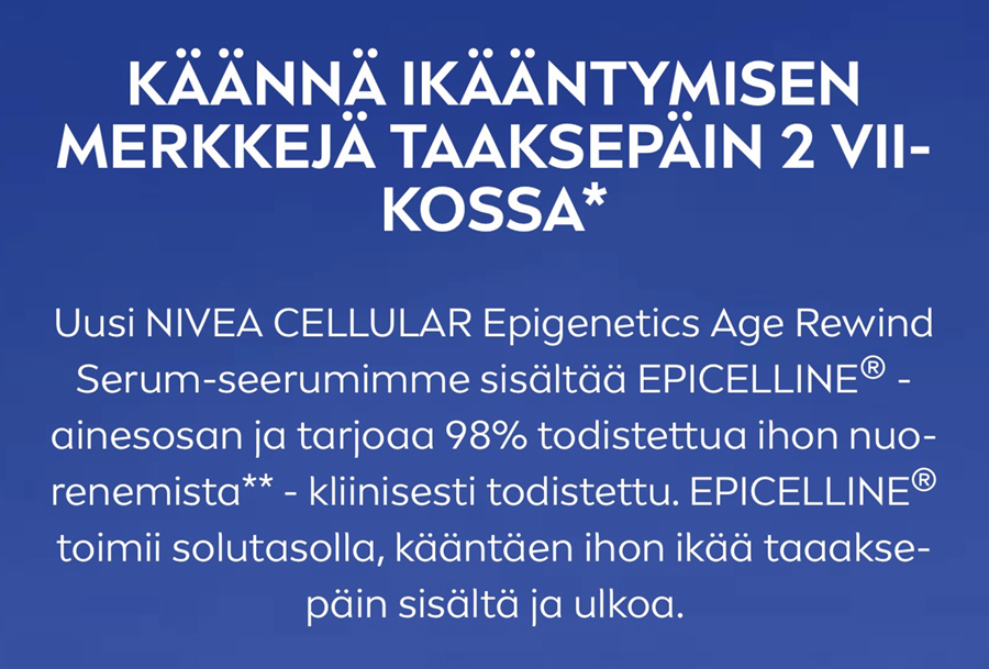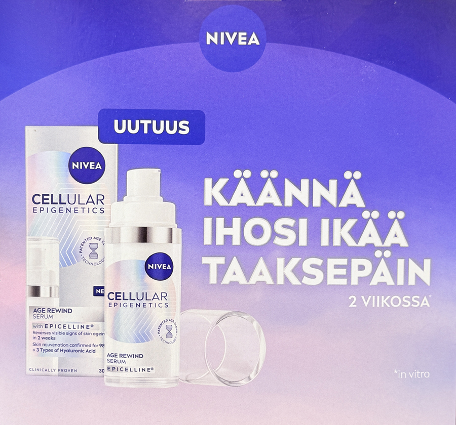 Kiinnitin itsekin jo alkutalvesta huomiota Nivean uuden Cellular Epignetics Age Rewind -seerumin mainoksiin, joissa pokkana kerrotaan seerumin "kääntävän ihon ikää taaksepäin kahdessa viikossa". Mainolauseissa todetaan myös silmääkään räpäyttämättä, että tuote "nuorentaa" ihoa.