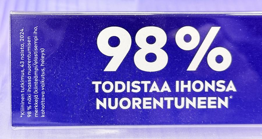 Nivean (Beiersfordin) kaltaisella jättifirmalla on epäilemättä tarkat ja asiansa osaavat tyypit vastaamassa mainonnan juridiikasta. Vaikka nuoruus-väittämät tuntuvat minusta ilman muuta olevan lainvastaisia, oli pääteltävissä, että jollain perusteella ne oli Nivean taholla nähty säännösten mukaisina.
