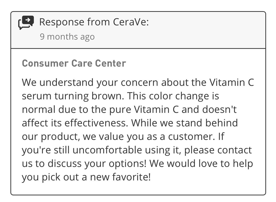 Netistä voi löytää runsaasti asiakkaiden ihmettelyä liittyen seerumin pH-arvoon mutta muihinkin epäkohtiin, esimerkiksi pakkauksen falskaaminen ja tuotteen epästabiilius nousevat yleisenä kritiikkinä. Keskusteluista ja asiakaspalautteista käy ilmi, että CeraVe-seerumin askorbiinihappo ei olekaan niin stabiili, kuin yritys mainonnassaan korostaa. CeraVe'n vastauksista tähän palautteeseen käy myös ilmi kiusallinen asiakkaan yleistiedon sekä ymmärryksen aliarviointi. En tiedä, olenko koskaan lukenut mitään näin noloa kosmetiikkayrityksen kirjoittamana.
