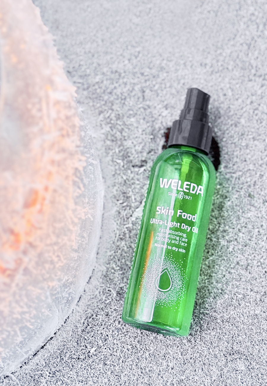 Tai kelpaisiko veden ja öljyn yhdistelmä? *Weledan Skin Food Ultra-Light Dry Oil on kevyt, vesi- ja öljyfaasin yhdistävä raikas suihke. Se sopii niin kasvoille kuin vartalolle! Tuotteessa on noin 60% öljyä ja 40% vettä ja vesiliukoisia aineita, kuten glyserolia, betaiinia, kamomilla- ja kehäkukkauutetta.