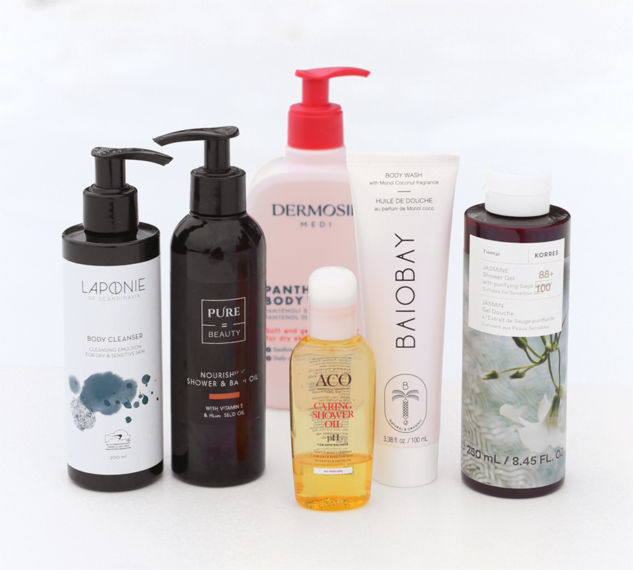 Hyviä suihkuöljyjä ovat mm. ACOn Caring Shower Oil ja Eucerin Shower Oil, joita kumpaakin saa hajustettuna ja hajusteettomana. Päivittäistavarakaupoista puolestaan saa Nivean Rich Care -suihkuöljyä (joka on Eucerinin edullinen dupe) ja valikoiduista marketeista *Dermosilin MEDI-suihkuöljyä, nämäkin ovat hyviä. Luonnonkosmetiikan puolella suihkuöljyjä on yllättävän vähän, ja paras tuntemani on *Pure Beautyn Nourishing Shower & Bath Oil.