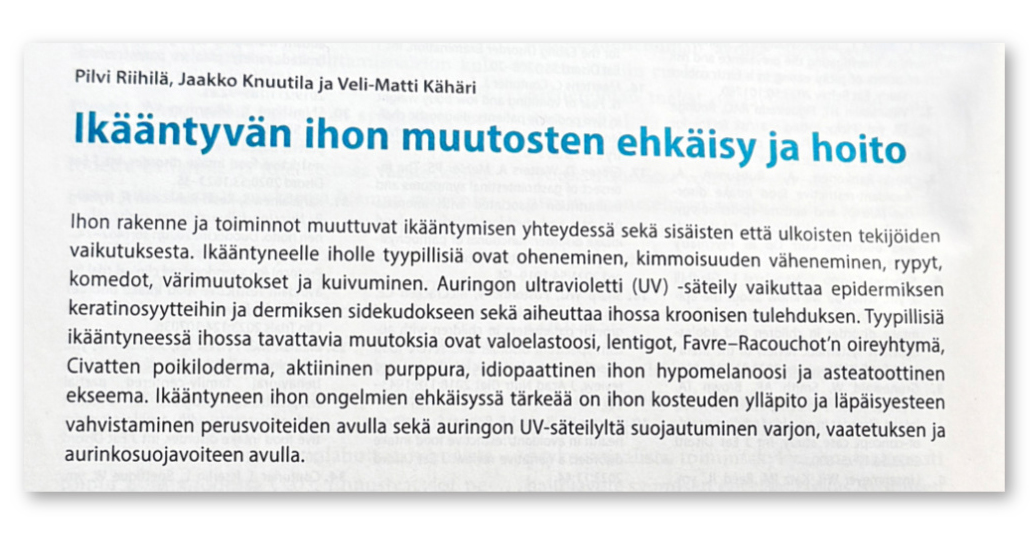 Artikkelin otsikko on Ikääntyvän ihon muutosten ehkäisy ja hoito ja sen ovat kirjoittaneet tohtorit Pilvi Riihilä, Jaakko Knuutila ja Veli-Matti Kähäri Turun yliopistosta ja Turun yliopistollisesta keskussairaalasta. Artikkeli on vertaisarvioitu, eli se on ihan ehta tieteellinen julkaisu. (Ei sillä että epäilisin, että Duodecimissa muuta julkaistaisiinkaan. 😅)