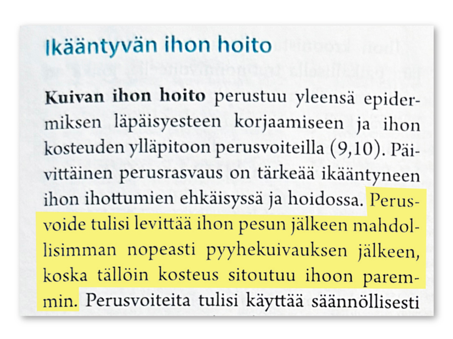 Artikkelissa ihon vesikosteuttaminen toteutuu levittämällä perusvoide pesun jälkeen kostealle iholle, jolloin voiteen sisältämät humektantit ja okklusiivit lukitsevat pesun jättämät vesimolekyylit ihoon. Eli ei mitään kasvovesiä, seerumeista puhumattakaan!