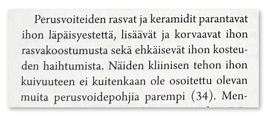Mä ymmärsin ton kohdan "perusvoiteiden rasvojen ja keramidien tehon ihon kuivuuteen ole osoitettu olevan muita perusvoidepohjia parempi" että keramidien tehoa ei ole osoitettu, mutta ehkä siinä tarkoitettiin myös lisärasvoja. Todella surkeasti sanoitettu lause, ja ainakaan omasta mielestäni siinä ei ole oikein mitään järkeä, pitää katsoa onko siinä enemmän järkeä, kun lukee koko artikkelin.