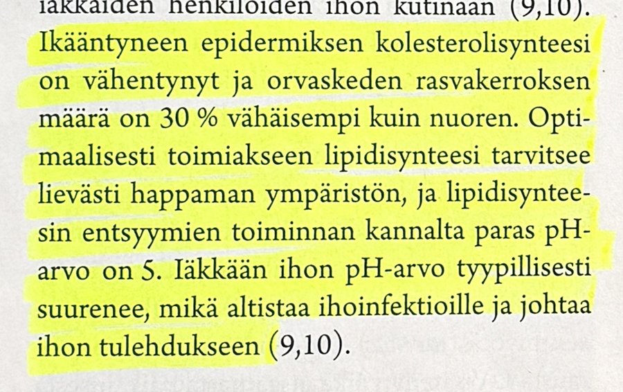 Sivulla 2 kerrotaan, että iän myötä ihon kolesterolisynteesi vähenee (= ihon omien rasvojen tuotanto vähenee), ja mainitaan, että toimiakseen optimaalisesti lipidisynteesi tarvitsee happaman ympäristön. (Juuri siksi ihomme luontainen pH on noin 4,5).