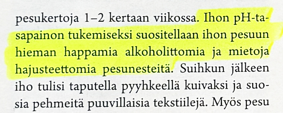 Sivulla 7 suositellaan ihon pH:n tasapainon tukemiseksi "hieman happamia alkoholittomia ja mietoja hajusteettomia pesunesteitä".