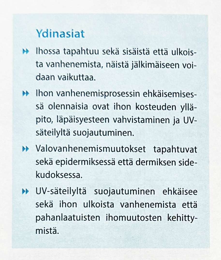 Joka tapauksessa artikkeli oli selkeässä faktapohjaisuudessaan kiinnostava, ja ainakin siinä kävi selvästi ilmi perusasiat ihon ikääntymisestä sekä myös siitä, millä peruskeinoilla ikääntymismuutoksia voi ihossa ehkäistä ja hidastaa.