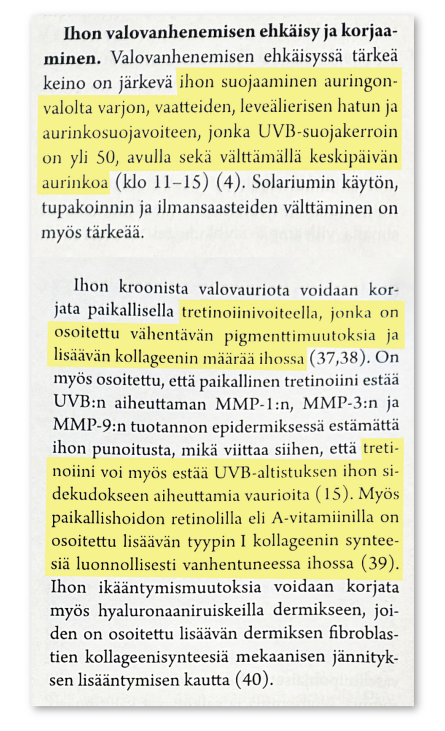 Tylsää kyllä, tämä osuus artikkelissa oli kaikkein lyhin. Tulee houkutus päätellä, että ehkä lääketieteellisestä näkökulmasta valovanhenemisen ehkäisy todella on näin yksinkertaista ja keinot voidaan kiteyttää yhden palstan pituuteen. Ja ne keinot ovat: auringolta suojautuminen ja A-vitamiinivoide.