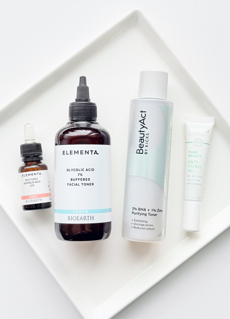 Glykolihappoa käytän miliumien poistoon ja viikottaisena kasvojen kuorintana, salisyylihappoa taas epäpuhtauksien nitistäjänä sekä nenänpielien ja korvien puhdistamiseen. Mulla rasvoittuu korvien iho (sieltä sisältä) voimakkaasti, ja puhdistus salisyylihapolla pitää ihon puhtaana ja vapaana kipeistä tukkeumista. Nenänpielissä taas on laajentuneet ihohuokoset, jotka keräävät talia. Nekin saavat säännöllisesti BHA-rakkautta. Koko kasvoja aniharvoin käsittelen BHA:lla.