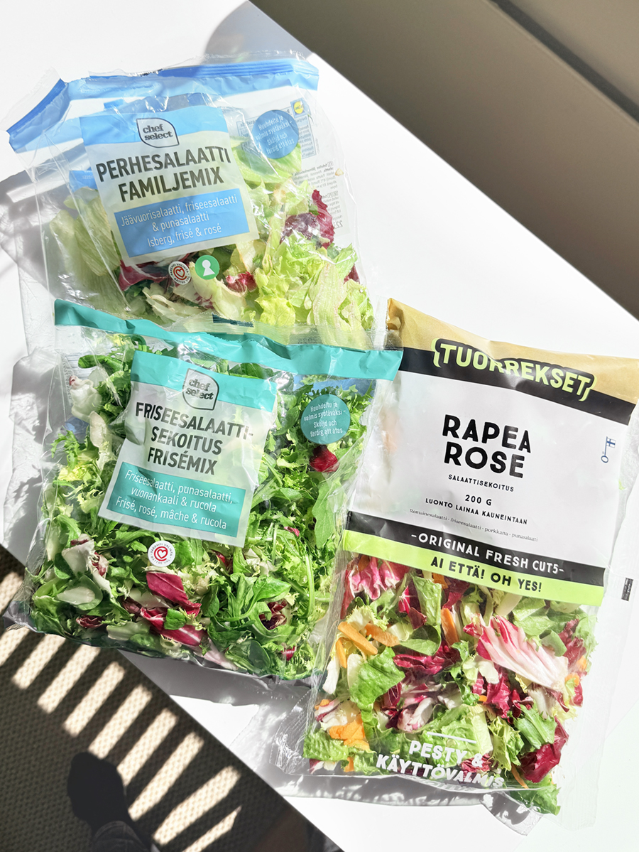 Lidlin frisee-sekoitus on mun ykkössuosikki, koska siinä on kaikkein mielenkiintoisin ja aromikkain salaattilajien sekoitus, ja tätä ostan eniten. Lidlin perhesalaattia ostan oikeastaan enää vain siksi, että Prisman Rapea Rose on niin usein lopussa - sen ovat löytäneet monet muutkin mun lisäksi. 😄 (Ja nyt mä tietysti ammun itseäni jalkaan jakamalla vinkin vielä julkisesti... 🤪)