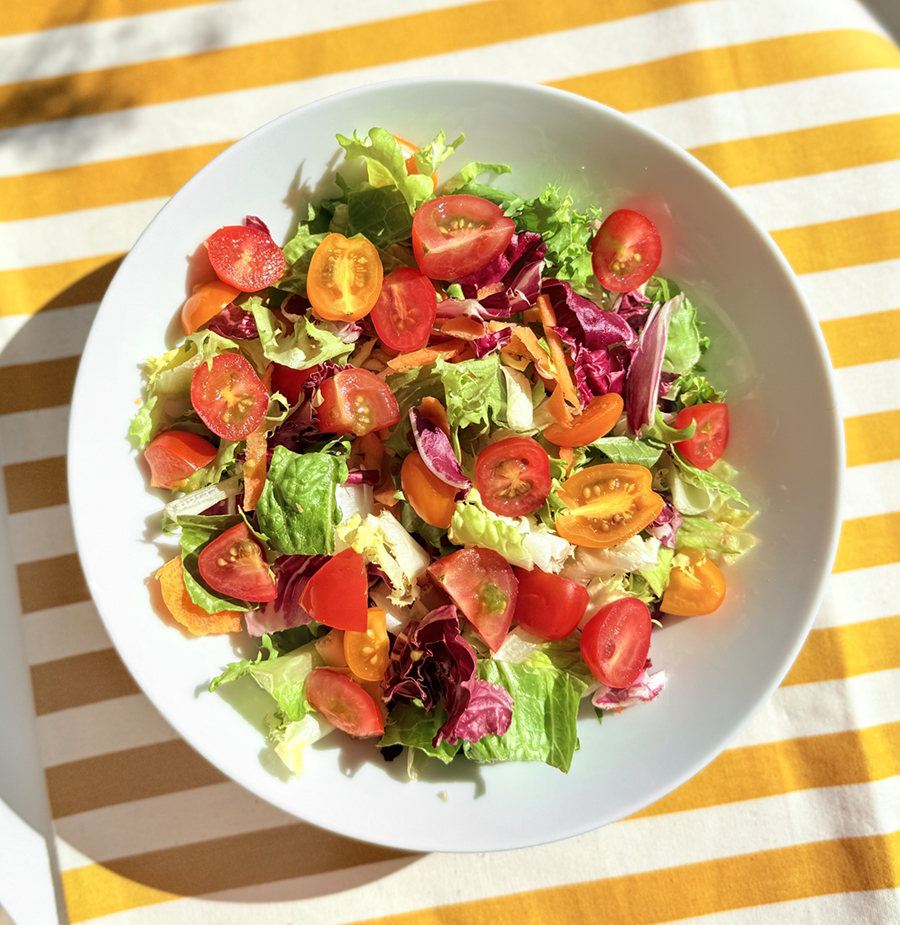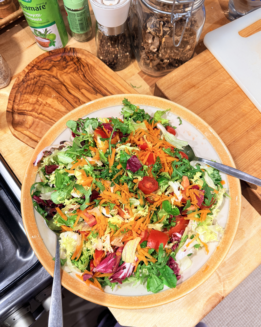 Heitänpä tähän vielä samalla ilolla mun salaatin perusreseptin. :) Syön salaattia joka ikinen päivä 1-3 kertaa, ja syy on se, että se on vain niin helppo ja nopea valmistaa, ja maistuu hyvälle! ☺️ Vhh-elämänmuutokseni jälkeisten vuosien mielikuvituksellinen kokki minussa on (harmillisesti kyllä) hiipunut, ja vaikka yhä syön vähähiilihydrattista ruokaa, syön joka päivä samoja perusarkiruokia. Salaatti on helpoin niistä.