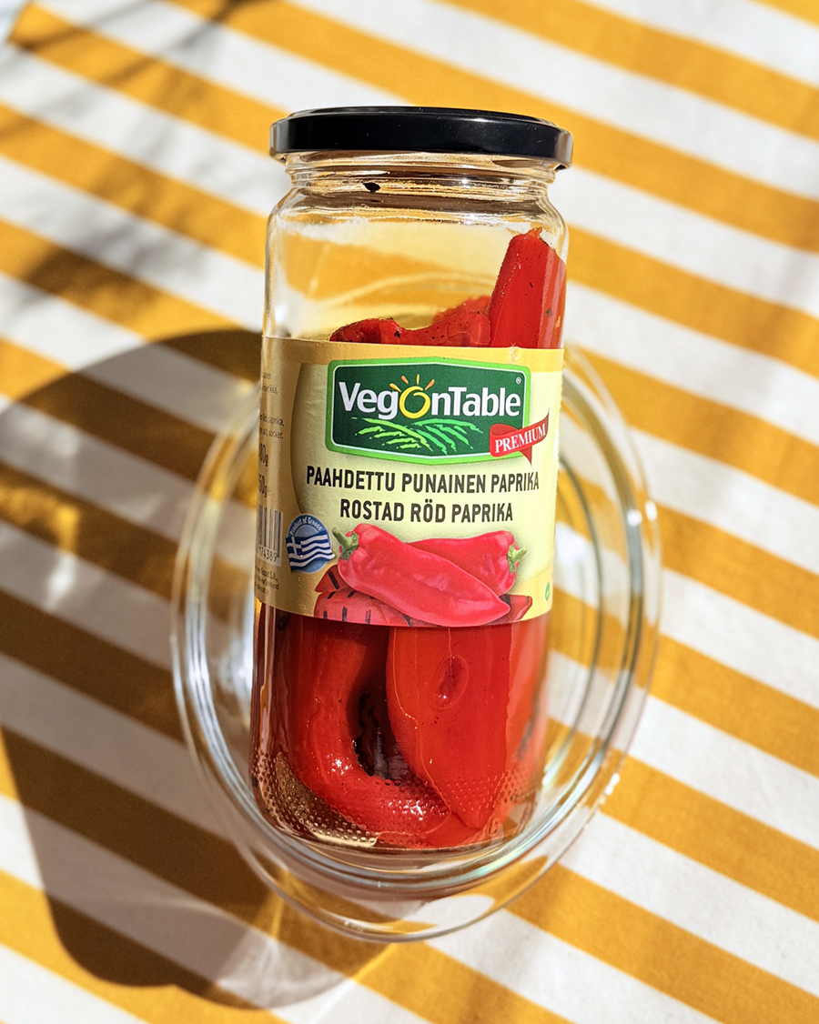 Paprikan ostan tyypillisesti valmiina säilykkeenä, se on jopa ihan edullinen, muut kasvikset paahdan itse. Bataatti on niin makeaa, että sitä käytän vain ihan pieniä määriä; jo pieni kourallinen paahdettuja bataattikuutioita tekee salaatista kunnon gourmet-version. 😋