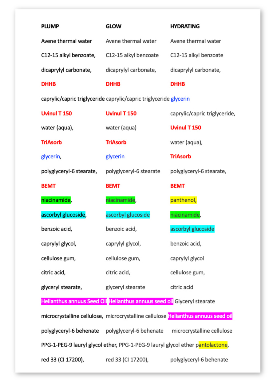 Plump ja Glow jakavat täysin identtisen inci-listan, ainoa ero on Plumppiin lisätty minimaalinen määrä hyaluronihappoa incin loppupäähän säilöntäaineiden jälkeen (katso yllä oleva inci-kuva). Jokainen voi ymmärtää, ettei tällä ole käytännössä mitään merkitystä luvatun ”täyteläisyyden” kannalta. Hydrating-seerumin inci on myös samanlainen, sillä pienellä erolla, että glyseroli on ylempänä kuin Plumpissa ja Glow'ssa, ja se sisältää pantenolia, jopa kahdessa muodossa; Panthenol ja Pantolactone. Se on siis oikeastikin jonkin verran kosteuttavampi kuin kaksi muuta.
